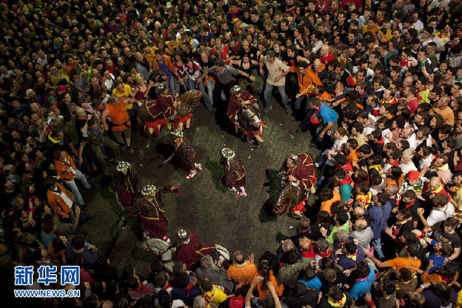 西班牙貝爾加(Berga)市的La Patum節上,裝扮成土耳其人的演員進行騎馬舞表演。
