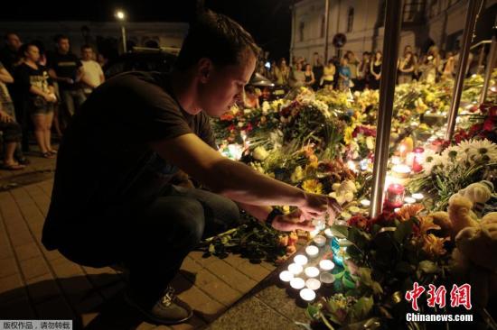 資料圖:7月17日,烏克蘭基輔,民眾們手持鮮花和蠟燭在荷蘭駐烏大使館前悼念馬航MH17事故遇難者。據(jù)稱,該架飛機(jī)上所載人數(shù)為298人,而此前報(bào)道稱飛機(jī)上共載295人。由于此次事件可能導(dǎo)致地面人員傷亡,總共的遇難人數(shù)將超過300人。