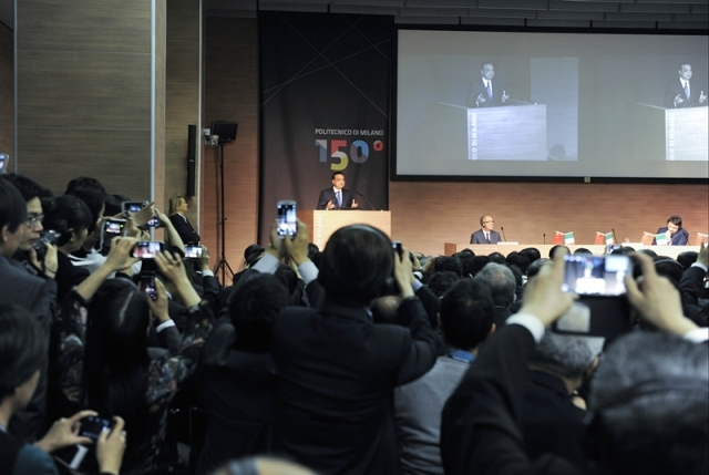克強總理的到來受到了米蘭理工大學師生的熱烈歡迎,大家揮舞著手中的兩國國旗,歡呼著迎接克強總理的到來,不少學生紛紛拿出手機拍照。除了米蘭理工大學的師生,參加今天活動的還有不少中意兩國創新行業的企業家。