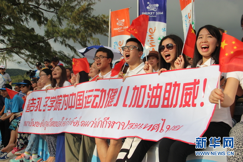 ??? 11月16日,普吉孔子學(xué)院的中國志愿者老師們?yōu)橹袊\(yùn)動(dòng)健兒加油。中國體育代表團(tuán)16日在泰國普吉舉行的第四屆亞洲沙灘運(yùn)動(dòng)會(huì)上勇奪2枚金牌和2枚銅牌。當(dāng)天比賽全部結(jié)束時(shí),中國隊(duì)以3金2銀5銅的成績暫列獎(jiǎng)牌榜第五,東道主泰國隊(duì)以9金11銀12銅的成績暫列金牌榜和獎(jiǎng)牌榜第一。新華社記者楊云燕攝
