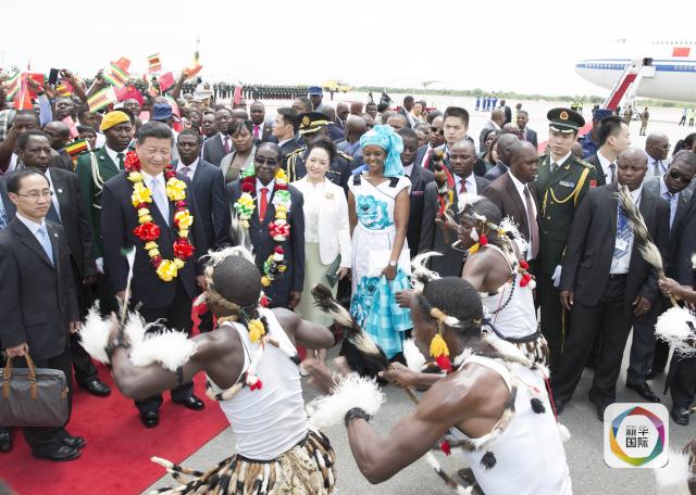 上午10時15分左右,專機(jī)降落,習(xí)主席和夫人彭麗媛走下旋梯。奏中津兩國國歌,鳴21響禮炮,檢閱儀仗隊,當(dāng)?shù)貎和I(xiàn)花環(huán)和鮮花……前來迎接的津巴布韋總統(tǒng)穆加貝,為習(xí)主席舉行了隆重的歡迎儀式。
