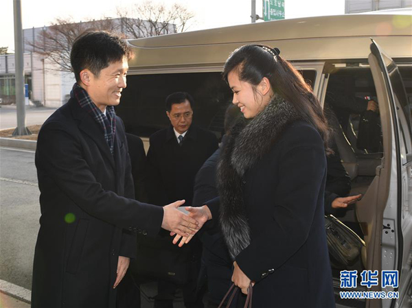 1月21日,朝鮮三池淵管弦樂團團長玄松月(右)到達位于朝韓邊境的韓國京畿道坡州市京義線韓朝出入境事務(wù)所。新華社發(fā)(韓國統(tǒng)一部提供)