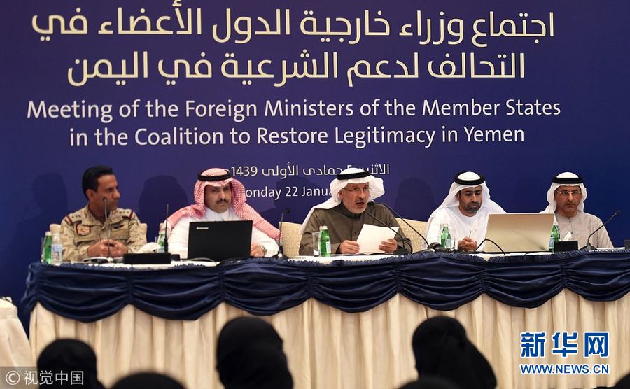 1月22日,沙特利雅得,沙特主導的打擊也門反政府武裝盟國舉行外長會議。為緩解人道危機,沙特主導的多國聯軍22日發表聲明說,將向也門提供15億美元的新援助。同時,打開一條通往中部馬里卜省的空中走廊以及17條陸上走廊,以運送援助物資;增擴也門口岸,以接收人道和基本物資。(圖片來源:視覺中國)
