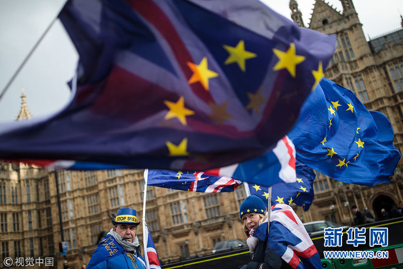 2月26日,英國(guó)倫敦,示威者在議會(huì)大廈外抗議“脫歐”。(圖片來(lái)源:視覺(jué)中國(guó))