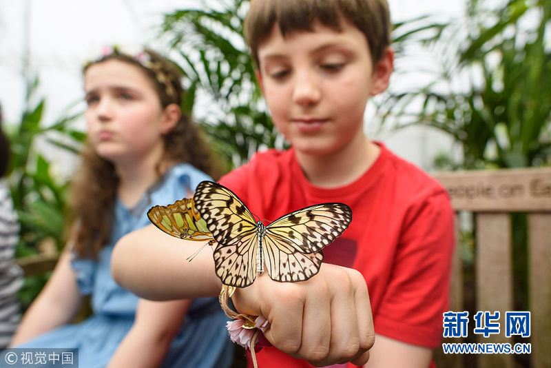 3月28日,英國倫敦自然歷史博物館舉辦奇異蝴蝶展,各式美麗新奇的蝴蝶翩翩飛舞,吸引了前來參觀的兒童與之親密接觸。(圖片來源:視覺中國)