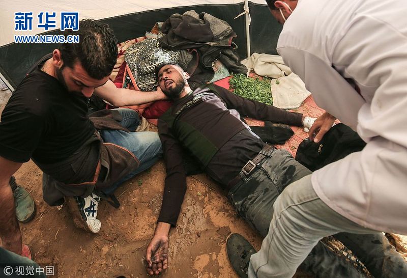 4月1日,加沙汗尤尼斯,在加沙地帶邊境沖突中受傷的巴勒斯坦人被送醫治療。巴勒斯坦人與以色列士兵30日在加沙地帶邊境爆發沖突,導致16名巴勒斯坦人死亡、上千人受傷。這天成為2014年巴以沖突后死傷最慘重的一天。(圖片來源:視覺中國)