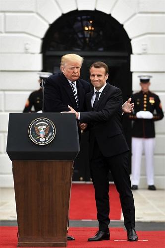 2018年4月24日,在美國華盛頓白宮,美國總統特朗普(左)與到訪的法國總統馬克龍出席歡迎儀式。 新華社記者楊承霖攝