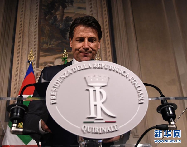5月27日,在意大利首都羅馬,意新任總理孔特發(fā)表講話。據(jù)當(dāng)?shù)孛襟w報道,孔特27日晚間與總統(tǒng)馬塔雷拉會面并提交擬定的內(nèi)閣成員名單時,馬塔雷拉否決了由意大利聯(lián)盟黨和五星運動力推的持疑歐立場的經(jīng)濟(jì)學(xué)家保羅·薩沃納出任財政部長。孔特向總統(tǒng)提出放棄組閣任務(wù)請求,請求得到總統(tǒng)確認(rèn)。新華社發(fā)(阿爾貝托·林格里亞攝)