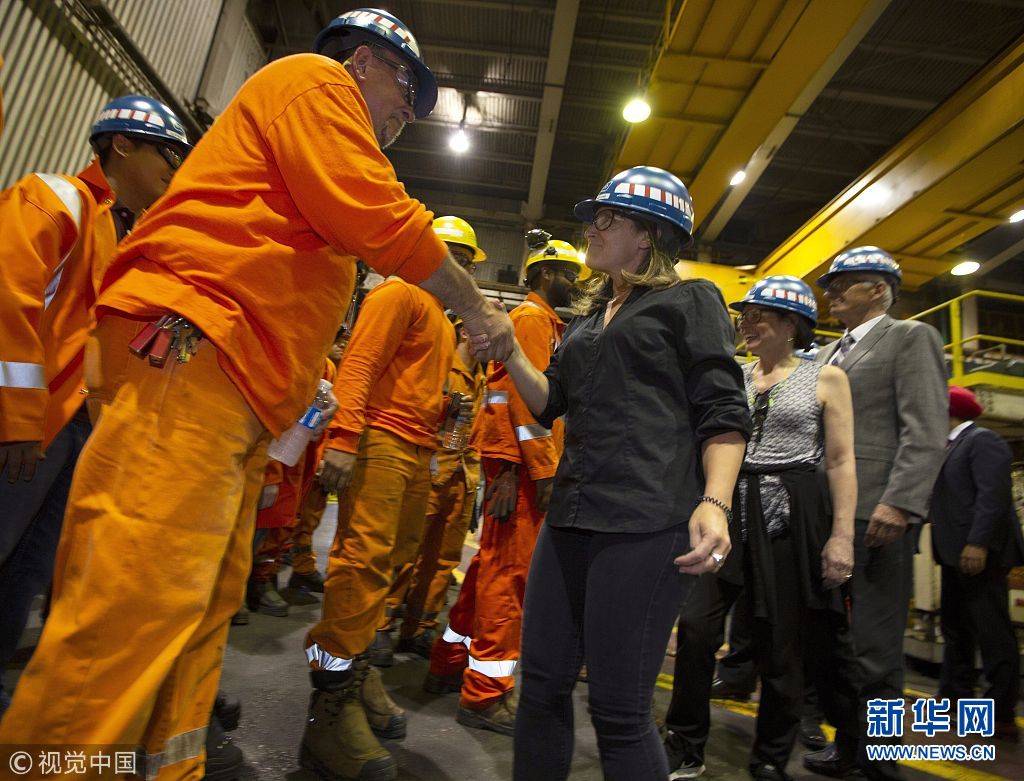 當地時間2018年6月29日,加拿大漢密爾頓,加拿大外交部長弗里蘭、經濟發展部長貝恩斯和勞工部長哈伊杜造訪斯特爾科鋼鐵公司,并共同宣布從7月1日起,加拿大將對約126億美元從美國進口的商品加征關稅,以報復特朗普政府對加拿大鋼鋁產品加征關稅。他們還表示,加拿大政府將向本國鋼鋁產業和制造業提供約15億美元財政援助。(圖片來源:視覺中國)