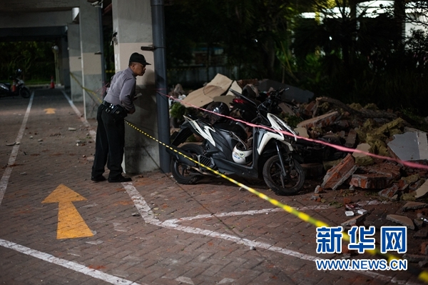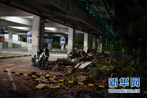 8月5日,在印度尼西亞西努沙登加拉省龍目島以西的巴厘島,一名安保人員查看一處停車場(chǎng)里的落石。 新華社發(fā)(穆罕默德·福齊·哈尼亞戈攝)