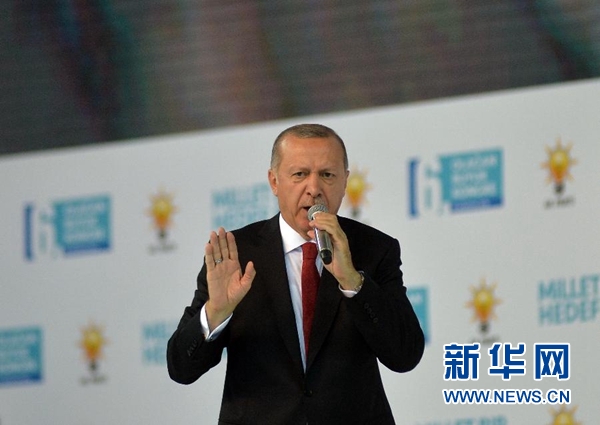8月18日,在土耳其首都安卡拉,土耳其總統(tǒng)埃爾多安在執(zhí)政黨正義與發(fā)展黨年度大會上發(fā)表演講。 土耳其總統(tǒng)埃爾多安18日表示,土耳其不會向經(jīng)濟(jì)威脅屈服。 新華社發(fā)(穆斯塔法·卡亞攝)