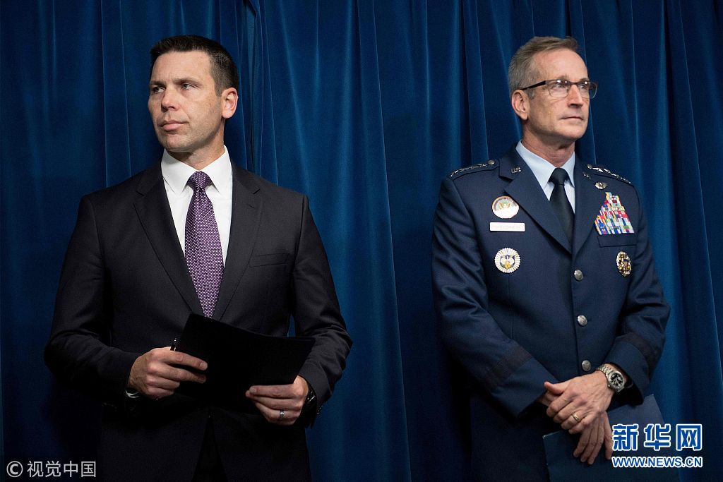 當?shù)貢r間2018年10月29日,美國華盛頓,美軍北方司令部司令奧肖內(nèi)西、美國海關(guān)和邊境保護局長凱文·麥卡利南舉行記者會。奧肖內(nèi)西29日宣布,美軍將派遣5200名現(xiàn)役士兵前往南部邊境,應對中美洲移民潮。近日,數(shù)千名來自洪都拉斯、危地馬拉和薩爾瓦多等中美洲國家民眾穿越邊界進入墨西哥。他們或步行、或乘坐大篷車北上,有意穿越墨西哥前往美國。 (圖片來源:視覺中國)