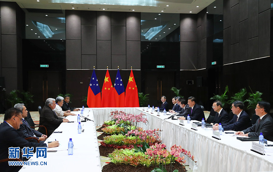 11月16日,國家主席習近平在莫爾茲比港分別會見建交太平洋島國領導人。這是習近平會見薩摩亞總理圖伊拉埃帕。 新華社記者 謝環馳 攝