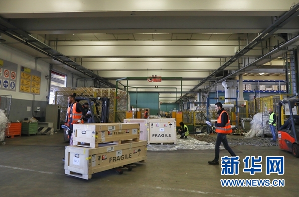 4月8日,在意大利米蘭馬爾彭薩機(jī)場,工作人員準(zhǔn)備將打包好的中國流失文物藝術(shù)品按規(guī)格裝到集裝板上,為中國流失文物藝術(shù)品上機(jī)作準(zhǔn)備。? 新華社記者 程婷婷 攝