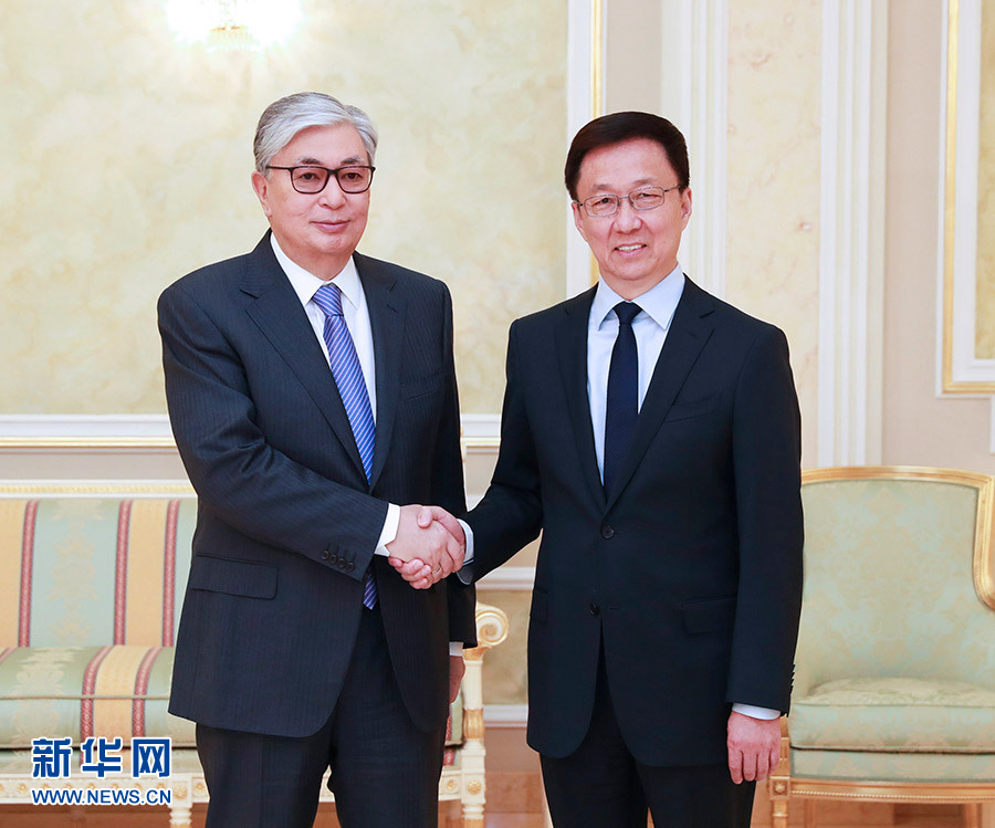 在會見托卡耶夫時,韓正首先轉(zhuǎn)達了習(xí)近平主席對托卡耶夫總統(tǒng)的親切問候。韓正說,在兩國元首的戰(zhàn)略引領(lǐng)和親自推動下,中哈全面戰(zhàn)略伙伴關(guān)系快速發(fā)展,雙方政治互信日益加深,各領(lǐng)域合作處于歷史最好水平,在地區(qū)乃至全世界樹立了睦鄰友好、互利共贏的典范。上個月習(xí)近平主席同納扎爾巴耶夫首任總統(tǒng)舉行了富有成果的會晤,向他頒授中華人民共和國“友誼勛章”,向國際社會展現(xiàn)了中哈關(guān)系的高水平和特殊性。共建“一帶一路”已成為中哈合作主線,雙方在發(fā)展戰(zhàn)略對接、合作機制建設(shè)、重大項目推進等方面碩果累累。中方愿與哈方一道,繼續(xù)深化絲綢之路經(jīng)濟帶與“光明之路”新經(jīng)濟政策對接,以產(chǎn)能、貿(mào)易、互聯(lián)互通、農(nóng)業(yè)、高技術(shù)、金融合作為優(yōu)先方向,不斷提升中哈合作含金量,更好地造福兩國和兩國人民。中方祝愿哈方順利實施“2050戰(zhàn)略”,在國家發(fā)展事業(yè)中不斷取得新的輝煌成就。