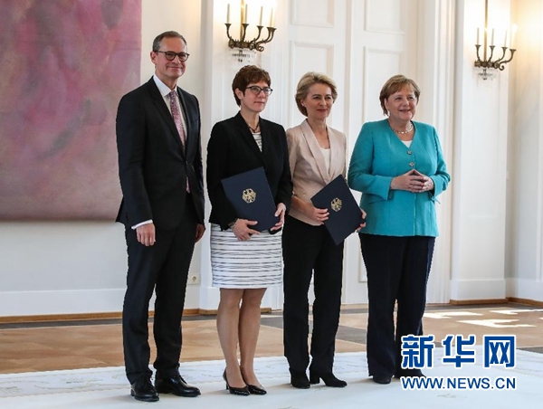 克蘭普-卡倫鮑爾當(dāng)天在德國(guó)總統(tǒng)府接受任命書(shū)。總理默克爾、馮德萊恩以及聯(lián)邦參議院第一副議長(zhǎng)米歇爾·穆勒出席任命儀式。