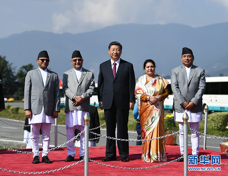 班達(dá)里在機(jī)場為習(xí)近平舉行隆重歡送儀式。尼泊爾副總統(tǒng)普恩、總理奧利、聯(lián)邦議會(huì)聯(lián)邦院主席蒂米爾西納、所有內(nèi)閣成員、軍方高級將領(lǐng)參加。