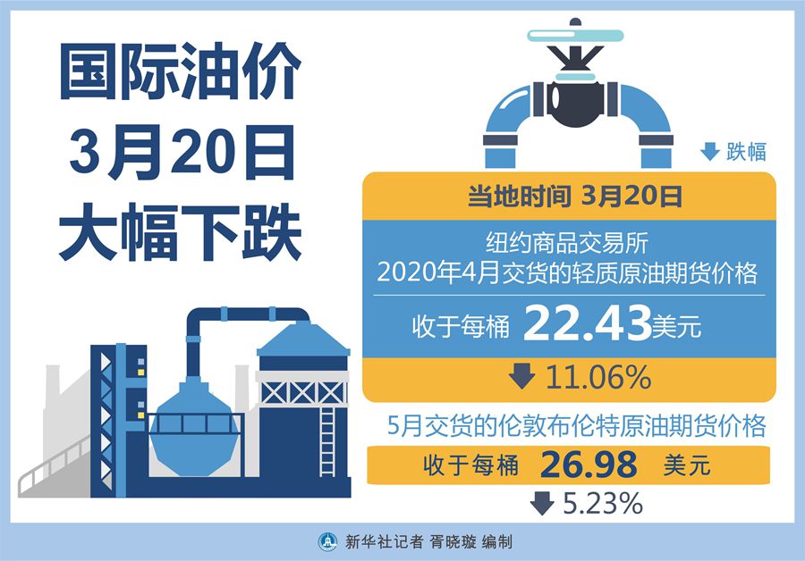 截至當(dāng)天收盤,紐約商品交易所4月交貨的輕質(zhì)原油期貨價(jià)格下跌2.79美元,收于每桶22.43美元,跌幅為11.06%。5月交貨的倫敦布倫特原油期貨價(jià)格下跌1.49美元,收于每桶26.98美元,跌幅為5.23%。