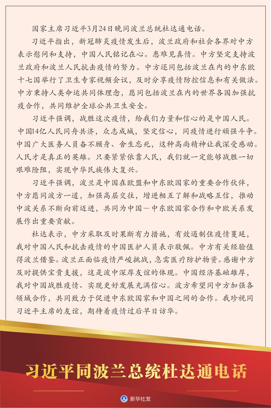 習近平指出,新冠肺炎疫情發生后,波蘭政府和社會各界對中方表示慰問和支持,中國人民銘記在心。患難見真情。中方堅定支持波蘭政府和波蘭人民抗擊疫情的努力。中方還同包括波蘭在內的中東歐十七國舉行了衛生專家視頻會議,及時分享疫情防控信息和有關做法。中方秉持人類命運共同體理念,愿同包括波蘭在內的世界各國加強抗疫合作,共同維護全球公共衛生安全。