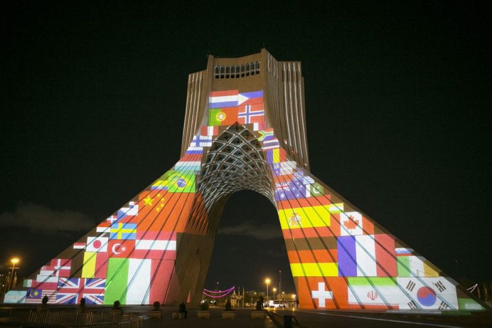 3月31日,伊朗首都德黑蘭地標建筑自由塔上演燈光秀,為世界抗擊新冠肺炎疫情加油。新華社發(艾哈邁德·哈拉比薩斯 攝)