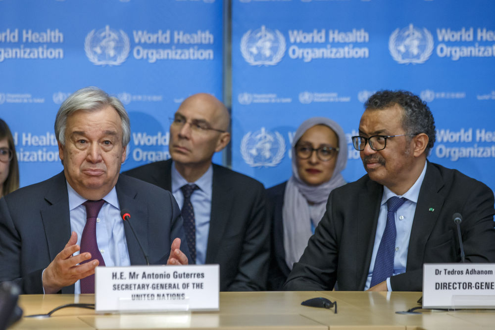 2月24日,在瑞士日內瓦,聯合國秘書長古特雷斯(左)在世界衛生組織總部發表講話。新華社發