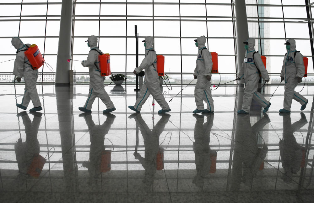 4月3日,在武漢天河機場,消防隊員進入航站樓進行消殺作業。新華社記者 程敏 攝