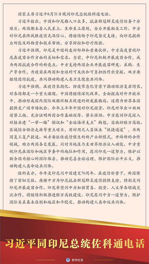 習近平指出,中國和印尼都人口眾多,抗擊新冠肺炎疫情任務十分艱巨。兩國都本著人民至上、生命至上原則,全力開展相關(guān)工作。中方對印尼最終戰(zhàn)勝疫情充滿信心,將繼續(xù)給予印尼堅定支持,向印尼提供力所能及的物資和技術(shù)幫助,分享防控和診療經(jīng)驗。
