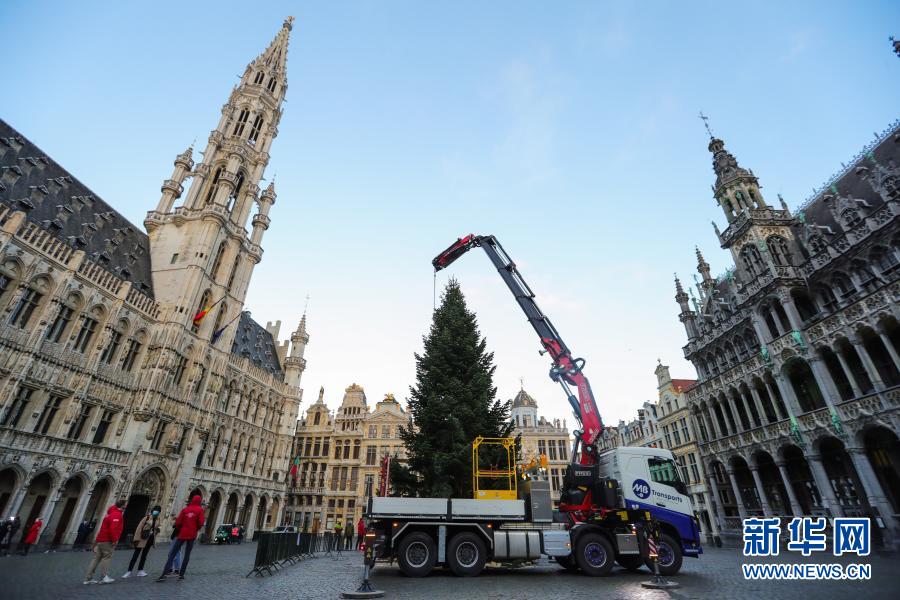 這是11月19日在比利時布魯塞爾大廣場拍攝的圣誕樹安裝現場。