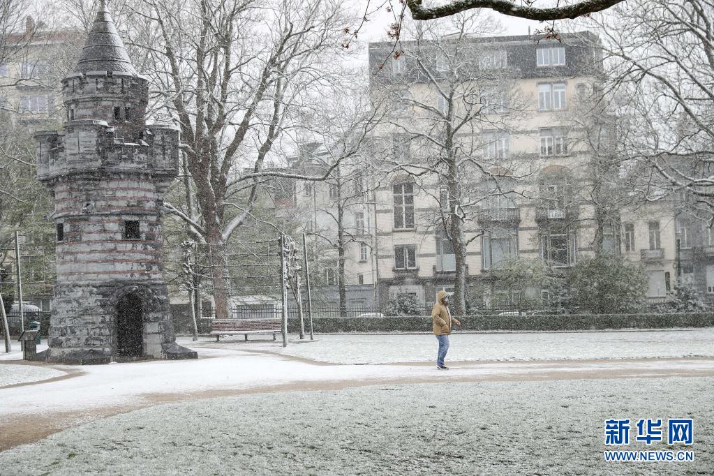 4月6日,一名行人在比利時布魯塞爾五十周年紀念公園冒雪出行。