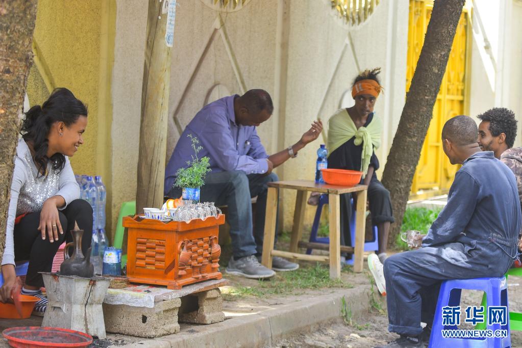 5月14日,一名女商販(左一)在埃塞俄比亞亞的斯亞貝巴街頭的咖啡攤售賣咖啡。