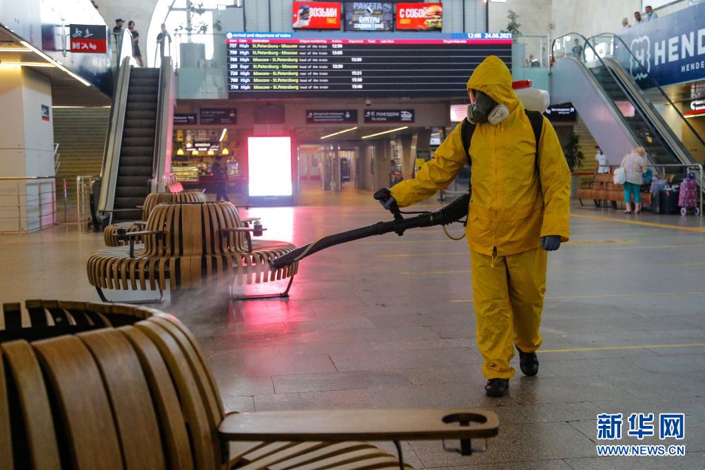 6月24日,工作人員身著防護服在俄羅斯莫斯科一個火車站進行消毒作業。