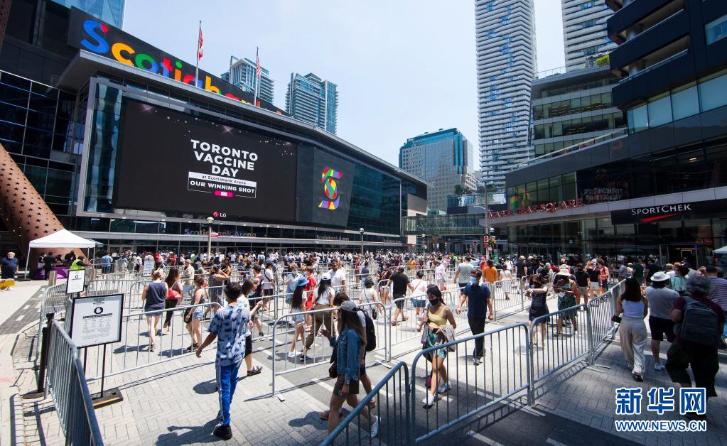 6月27日,在加拿大多倫多,人們排隊進入大型新冠疫苗接種中心。